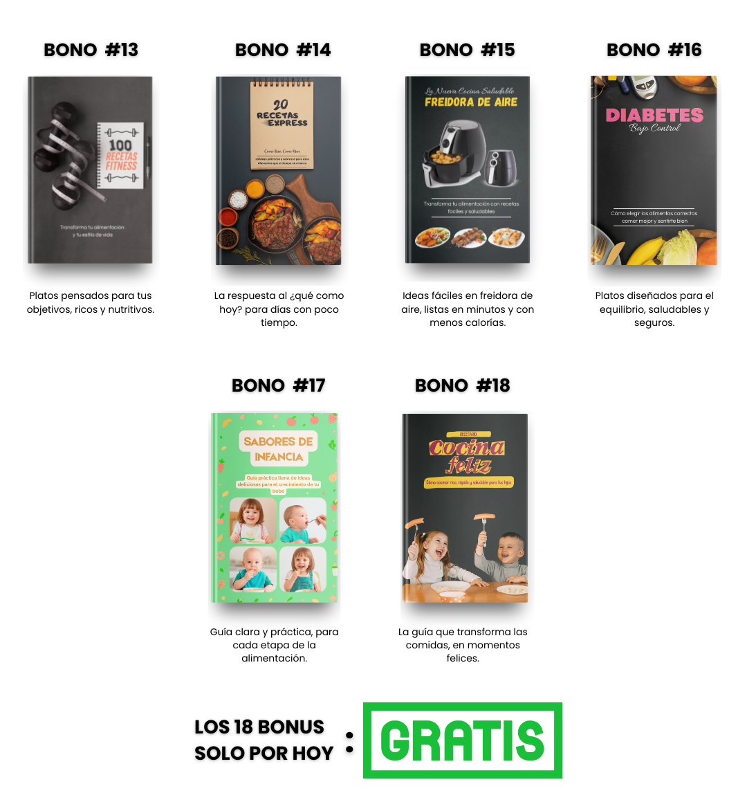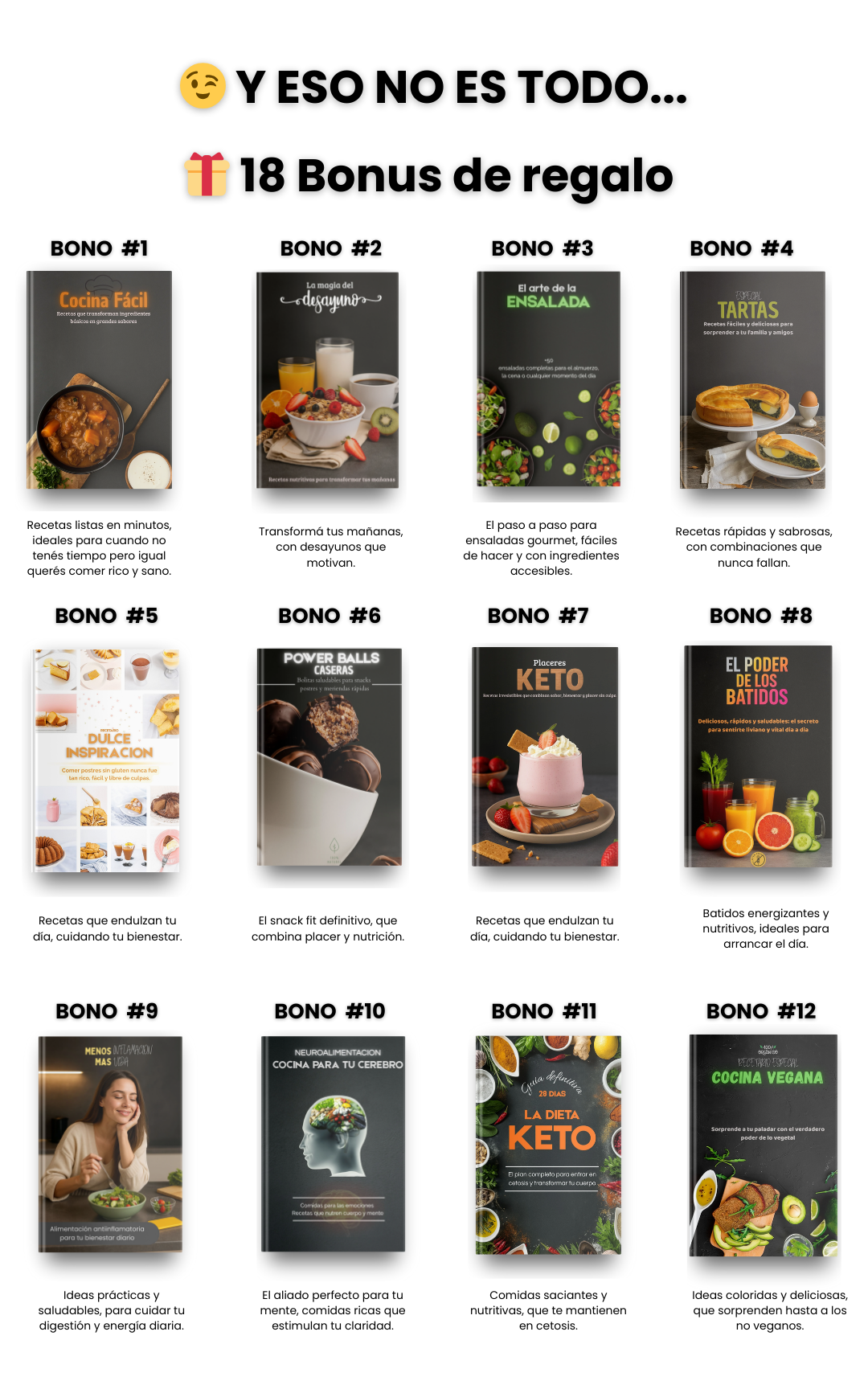 Incluye más de 700 recetas variadas: platos básicos, elaborados, postres, recetas para niños, opciones saludables, dietas keto, recetas para diabéticos y mucho más. Además, trae 18 bonus exclusivos con temáticas especiales.